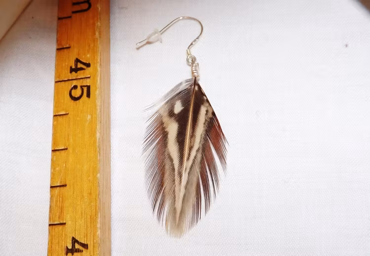 Handgjort örhänge med fjäder från fasan. Krokarna är i 925 sterling silver (äkta silver) och fjädrarna finns i flera olika storlekar och utföranden. Vi skickar gärna bilder så att du själv kan välja vilket/vilka du vill ha. Obs! Vi säljer dem styckvis, om du t.ex. har ojämnt antal hål, bara vill ha i ena örat etc. Ett par örhängen kostar alltså 98:- plus frakt.